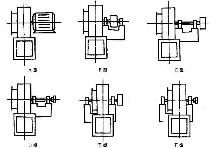 3、皮帶傳動。皮帶傳動顧名思義就是通過皮帶與皮帶輪來驅(qū)動風機的運轉(zhuǎn)。皮帶傳動式由于皮帶輪位置的不同又可分為4種形式